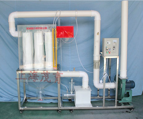 其主要原理是:含塵氣流從進(jìn)氣管進(jìn)入除塵設(shè)備后,從圓筒形濾袋外側(cè)向布袋內(nèi)側(cè)流動,在通過濾料的孔隙時,粉塵被捕集與濾料上,透過濾料的清潔氣體由濾袋上部開口排出。沉積在濾料上的粉塵,可定期由在安裝在布袋開口上方的壓縮空氣噴嘴釋放高壓氣體而造成布袋膨脹、振動而從濾料表面脫落,落入灰斗中。因為濾料本身網(wǎng)孔較大,因而新鮮濾料的除塵效率較低,粉塵因截流、慣性碰撞、靜電和擴(kuò)散等作用,逐漸在濾袋表面形成粉塵層,常稱為粉層初層。初層形成后,它成為袋式除塵器的主要過濾層,提高了除塵效率。濾布只不過起著形成粉層初層和支撐它的骨架作用,但隨著粉塵在濾袋上積聚,濾袋兩側(cè)的壓力差增大,會把有些已附在濾料上的細(xì)小粉塵擠壓過去,使除塵效率顯著下降。另外,若除塵器阻力過高,還會使除塵系統(tǒng)的處理氣量顯著下降,影響生產(chǎn)系統(tǒng)的排風(fēng)效果。因此,除塵器阻力達(dá)到一定數(shù)值后,要及時清灰。本設(shè)備可作為布袋除塵凈化實驗原理演示裝置