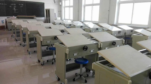 工程制圖實驗室是理工科主要的技術基礎課.如何更快地培養(yǎng)學生的空間思維能力,更有效地掌握繪圖基本功,這是廣大師生多年愿望。該制圖桌采用鋼木結構,桌面可調節(jié)傾角、工作臺下面抽屜供放學習資料工具書等功能。
