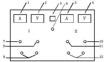 1——Ⅰ路電流輸出指示 5——Ⅰ、Ⅱ路電源開關(guān) 9——Ⅰ路電源輸出接線柱