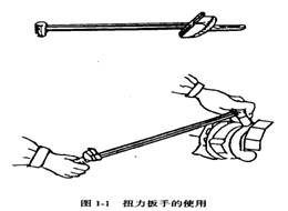 扭力扳手如圖1—1所示,是能夠控制扭矩大小的扳手,由扭力桿和套筒頭組成。凡是對螺母、螺栓有明確規(guī)定扭力的(如氣缸蓋、曲軸與連桿的螺栓、螺母等),都要使用扭力扳手。在扭緊時(shí)指針可以表示出扭矩?cái)?shù)值,通常使用的規(guī)格為0~300N.m。