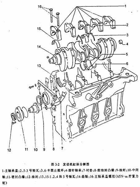 (2)將曲軸放入缸體的軸承座孔中,按照標(biāo)記裝上各道主軸承蓋,按規(guī)定力矩依次擰緊各道軸承蓋螺栓(力矩為69N•m),安裝止推墊片后應(yīng)軸向撬動(dòng)曲軸檢查其軸向間隙,每緊固一道主軸承蓋應(yīng)轉(zhuǎn)動(dòng)曲軸數(shù)圈,檢查其徑向間隙,若軸承過緊或過松,應(yīng)查明原因,加以排除。