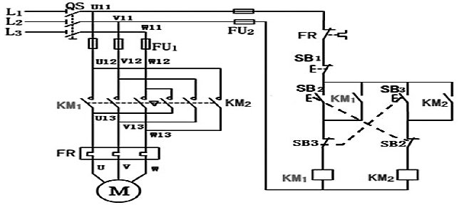 三種電路均由電源隔離開關(guān)QS;交流接觸器KM1、KM2;熱繼電器FR;熔斷器FU1、FU2,啟動(dòng)按鈕SB2、SB3;停止按鈕SB1及電動(dòng)機(jī)M組成。電路中各個(gè)元件的文字符號(hào)、圖形表示、工作原理、實(shí)物的觸點(diǎn)等,是學(xué)習(xí)電路工作原理的基礎(chǔ)。