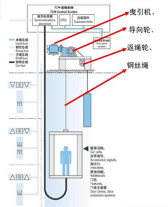 電梯曳引機(jī)是電梯的動(dòng)力設(shè)備,又稱電梯主機(jī)。功能是輸送與傳遞動(dòng)力使電梯運(yùn)行。它由電動(dòng)機(jī)、制動(dòng)器、聯(lián)軸器、減速箱、曳引輪、機(jī)架和導(dǎo)向輪及附屬盤車手輪等組成。導(dǎo)向輪一般裝在機(jī)架或機(jī)架下的承重梁上。盤車手輪有的固定在電機(jī)軸上,也有平時(shí)掛在附近墻上,使用時(shí)再套在電機(jī)軸上。