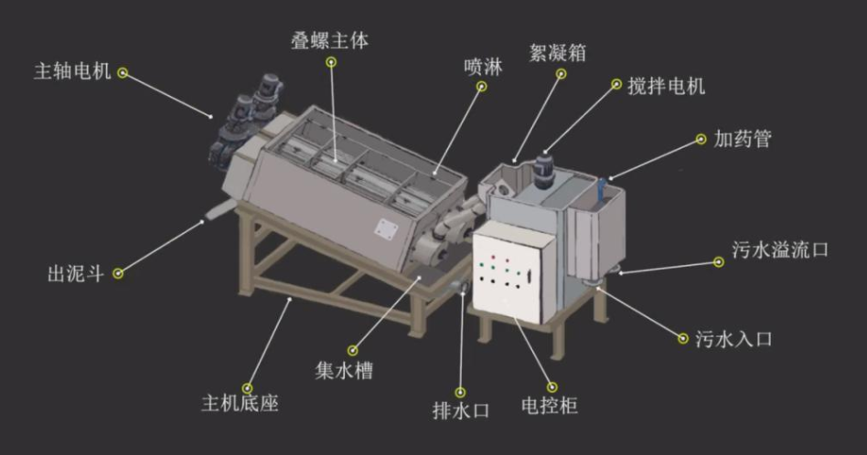 4.堆垛式污泥脫水器:過濾體由堆垛式定環(huán)和螺旋軸線穿過的動環(huán)組成。濾液從固定環(huán)和活動環(huán)形成的過濾接頭排出,泥餅從脫水部末端排出。