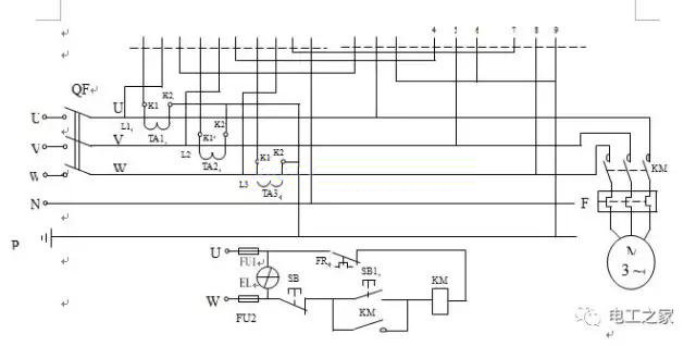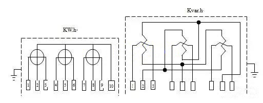 有功功率電表的電流量電磁線圈始端1、4、7各自接U相、V相、W相電壓互感器的二次側(cè)K1,其尾端3、6、9各自先后與無功功率表電流量電磁線圈的始端1、4、7相串連,無功功率表的電流量電磁線圈的尾端3、6、9各自收到電壓互感器的二次側(cè)K2,且K2接地裝置。(這里的電線接頭為PE線,事實(shí)上3、6、9接進(jìn)PE線上)
