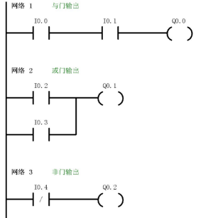 撥動輸入開關(guān)I0.2、I0.3、I0.4,觀察輸出指示燈Q0.1、Q0.2是否符合與、或、非邏輯的正確結(jié)果。