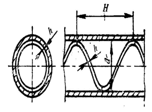 螺旋線圈的結(jié)構(gòu)圖如圖1所示,螺旋線圈由直徑3mm以下的銅絲和鋼絲按一定節(jié)距繞成。將金屬螺旋線圈插入并固定在管內(nèi),即可構(gòu)成一種強(qiáng)化傳熱管。在近壁區(qū)域,流體一面由于螺旋線圈的作用而發(fā)生旋轉(zhuǎn),一面還周期性地受到線圈的螺旋金屬絲的擾動(dòng),因而可以使傳熱強(qiáng)化。由于繞制線圈的金屬絲直徑很細(xì),流體旋流強(qiáng)度也較弱,所以阻力較小,有利于節(jié)省能源。螺旋線圈是以線圈節(jié)距H與管內(nèi)徑d的比值技術(shù)參數(shù),且長(zhǎng)徑比是影響傳熱效果和阻力系數(shù)的重要因素?茖W(xué)家通過(guò)實(shí)驗(yàn)研究總結(jié)了形式為的經(jīng)驗(yàn)公式,其中B和m的值因螺旋絲尺寸不同而不同。