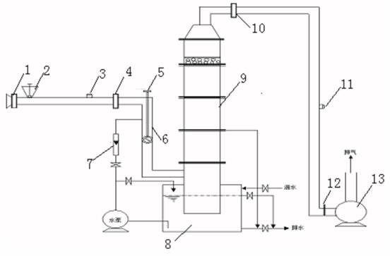 1. 入口管段測(cè)壓環(huán);2. 自動(dòng)粉塵加料裝置;3. 入口管段采樣口;4. 除塵器入口測(cè)壓環(huán);5. 旋轉(zhuǎn)升降杠; 6. 文丘里洗滌器;7. 流量計(jì);8. 儲(chǔ)液槽;9. 脫水筒;10. 出口管段測(cè)壓環(huán);11. 出口管段采樣口;12. 風(fēng)量調(diào)節(jié)閥;13. 高壓離心風(fēng)機(jī)