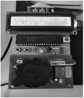 如4圖進行了對于溫度的測試,在產(chǎn)品中加入了溫度修改按鍵,通過兩個按鍵可以對于報警溫度進行設(shè)定,測試時室內(nèi)溫度為18℃,將溫度閾值設(shè)定在20℃,此時蜂鳴器未報警。隨后將溫度設(shè)定在17℃,蜂鳴器報警。